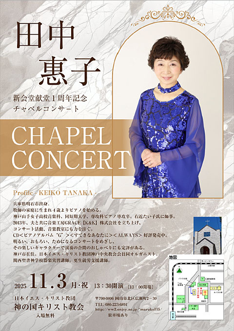 新会堂献堂1周年記念チャペルコンサート 2025年11月3日(月・祝) 13:30開演 (13:00開場)入場無料