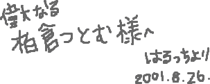 | まだまだ暑いというのに、お店に並んでいるのは秋の服、いつもこの時期、この暑いのに秋のことなんか考えられるかいなと全く無関心でいるから、秋になって自業自得、因果応報な目に遭うのだと、分かってはいてもやはり見る気にはなれない、そんな晩夏な時期です。って、男性にとってはどんな晩夏なんでしょう。……なんてことはともかく、柏倉さんお元気ですか。重症な夏バテをしなかったと思えば風邪を引いたり、風邪が治ったと思ったら夏バテしてたりなんてこと、ございませんか? わたしだけだといいのですが……。わたしの場合、夏だからバテたんでなくて、年中やる気がないだけ。 相変わらず音響演出家として相当ご活躍の柏倉さん、「はじめの一歩」「Tales of Eternia」「頭文字D」「Spirit of Wonder Vol.1」「The soul taker」「学園戦記ムリョウ」「メトロポリス」といっぱいいっぱいご活躍☆ いろ〜んなところで柏倉さんのお名前を見つけるんです。これがうれしくって!! そして、唯一お声の聞ける「ちびまる子ちゃん」が、楽しくてたまりません。はまじメインの話もあったり、ちょい役だったり、出演がなかったりもしますが……、はまじ以外の青年声まで聞けたり、はまじがアリになったりと、近頃サービスですよねぇ〜☆ 週に1度、いえ、月に2〜3回、いえいえ、月に1度でも聞けるだけで、わたくし幸せでございます。柏倉さんが元気でいらっしゃるのも分かるし。 音響演出というお仕事、具体的に何をどうしていらっしゃるのか素人のわたしにはちょっと分かりにくいし、番組の表面に分かりやすく出てこないし、どうやって応援したらいいかちょっと難しいのですが、その作品全体の出来栄え、つまり結果ですよね、話題性とか、視聴率とか、DVDの売上とかが、作品の出来栄えの1つの結果ならば、わたしも見なくては。買わなくては……。でも今は、声が聴きたい。聴いていたい……。 最近、柏倉さん鑑賞が「ちびまる子ちゃん」にかかりきりになってしまってますが、「アウトロースター」や「遊戯王」が見たくてたまりません。←っちゅーことは、わたしはまだ知りませんということです。申し訳ないです……。 思えば去年の盆、わたしは柏倉さんの虜と化してしまったのでした。ええ、おかげさまで1年です。早いです。1日はあんなに長いのに、1年はこんなに早いです。もう少しだけ、この失礼なHPを続けさせてください。これからも、がんばってくださいね、柏倉さん。 柏倉さん、好き好きっ☆ ![]() |